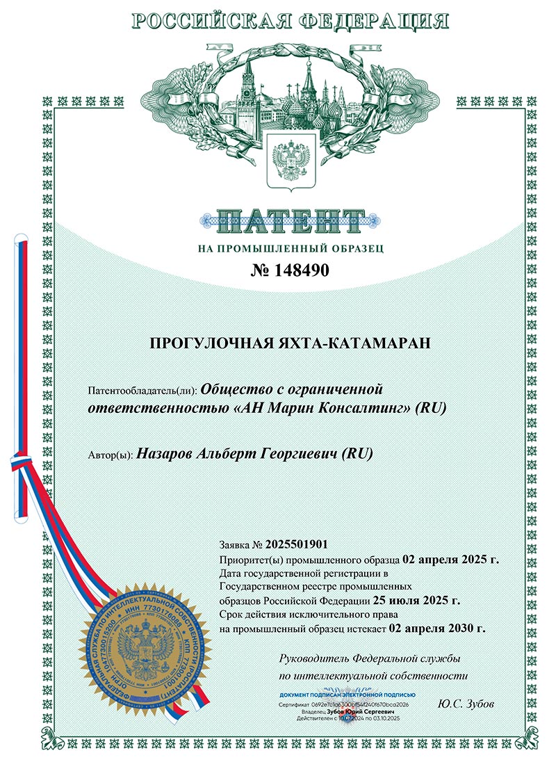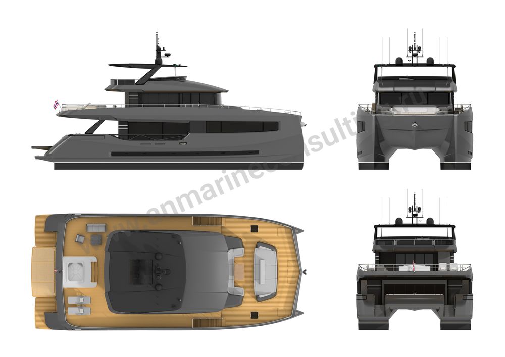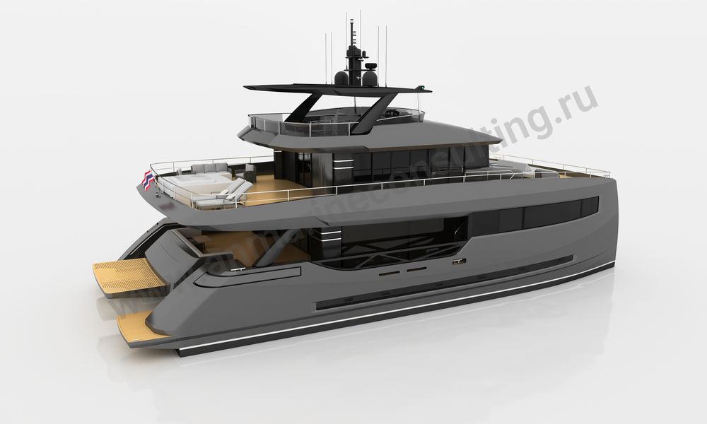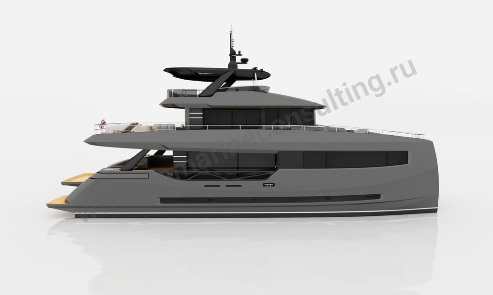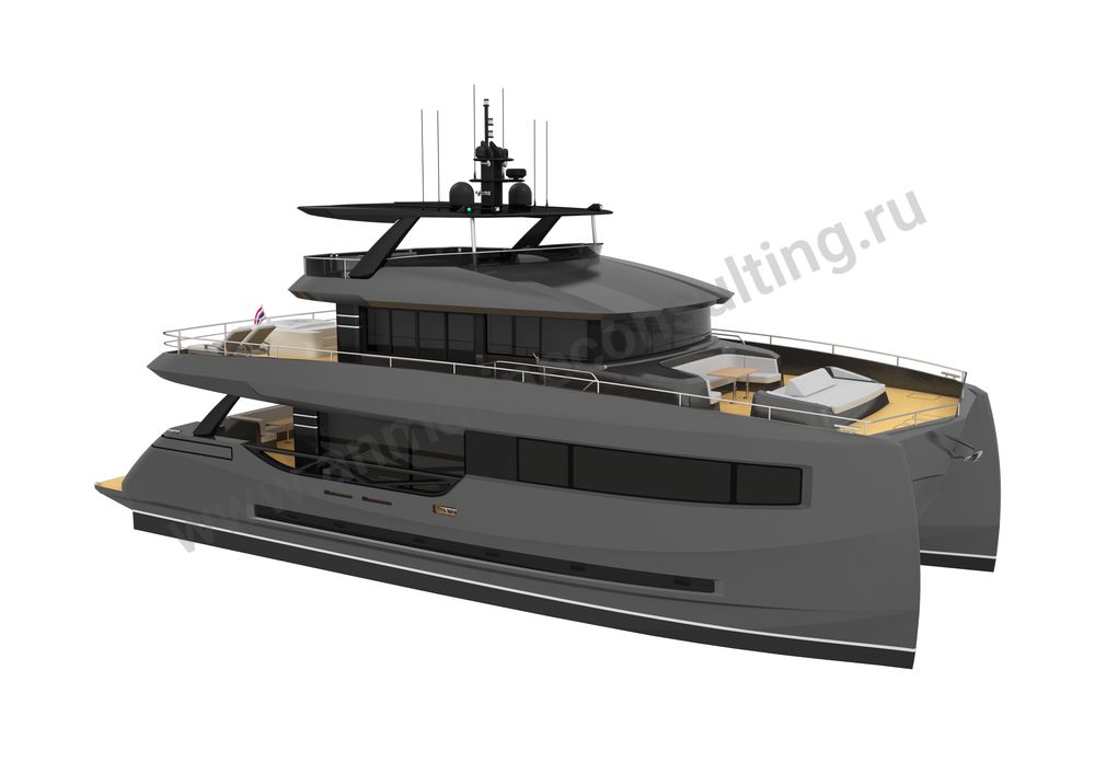 Основные характеристики: длина наибольшая 26,20м, ширина наибольшая 11,17м, двигатели 2x1000 л.с., скорость 10..24уз, материал корпуса - композит, пассажировместимость/экипаж 8/4 человек.