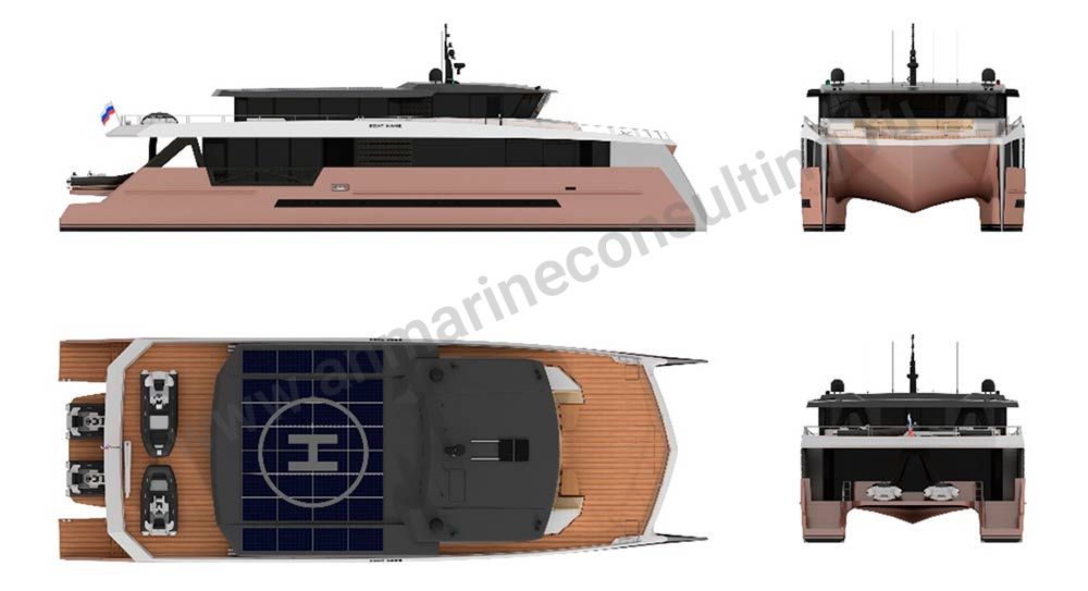 Основные характеристики: максимальная длина 32,45 м, ширина 11,45 м, материал корпуса – композит.
